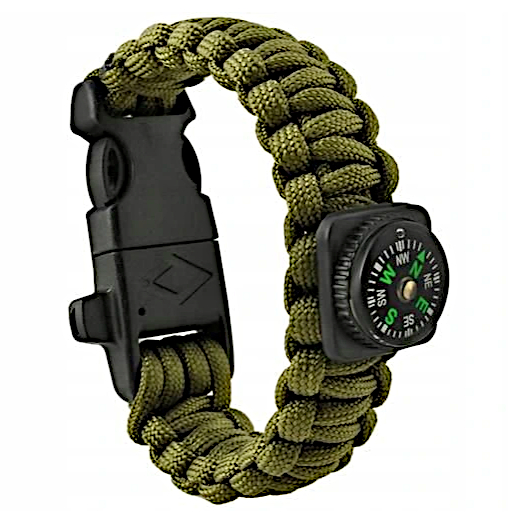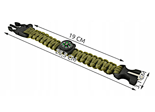 Bransoletka survivalova Paracord w zielonym kolorze to prosty w użyciu i łatwy w transporcie gadżet, który gwarantuje aż 5 funkcji w jednym produkcie.
