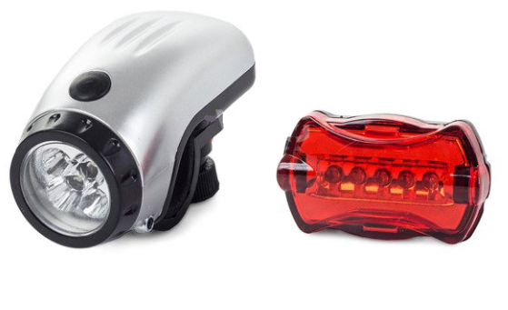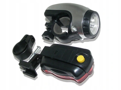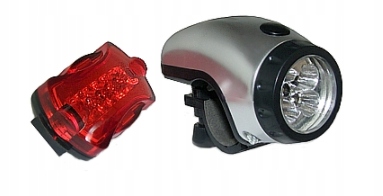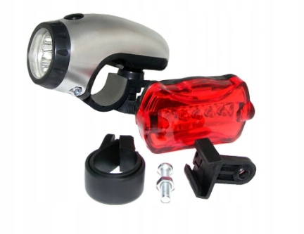 Zestaw oświetlenia rowerowego w skład którego wchodzi latarka przednia 5 LED wraz z uchwytem montażowym oraz tylna lampka 5 LED wraz z uchwytem do mocowania.