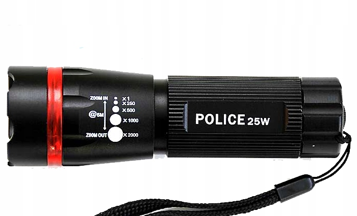 Latarka typu "szperacz" wyposażona jest w popularną diodę CREE Q5 oraz zasięgiem przy pełnym naładowaniu od 50m do 130m - w zależności od ustawienia funkcji zoom - MOC 25W / 100 LUMENÓW.