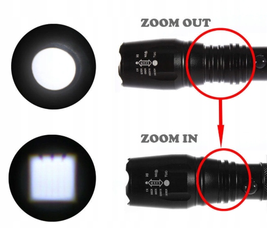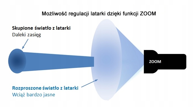 Latarka wyposażona jest w płynną regulację funkcji zoom + 3 funkcje świecenia: