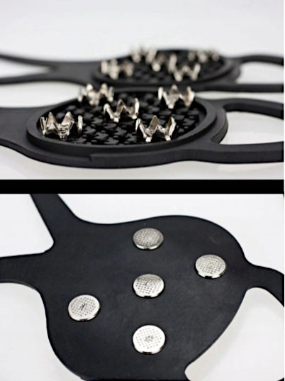 Nakładki wykonane są ze specjalnej elastycznej gumy odpornej na niskie temperatury, która zachowującego swoje właściwości nawet w temperaturze – 40°C oraz wyposażone są w 5 metalowych wykonanych ze stali wysokiej jakości.