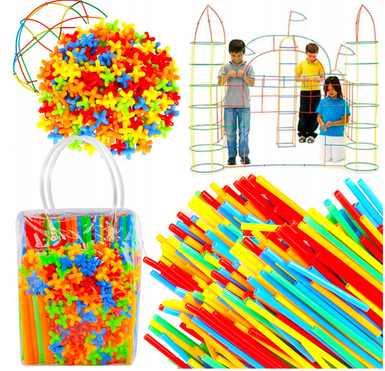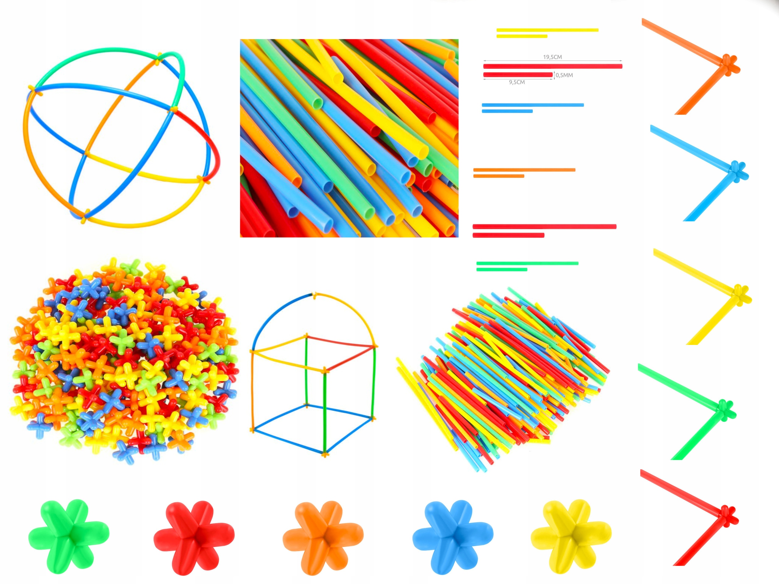 Klocki słomki to zestaw aż 408 elementów, z których można zbudować niezliczoną ilość projektów. Prosta zasada składania sprawia, że w kilka chwil można zaprojektować niemal dowolny kształt. Czy będzie to samolot, auto, domek, statek bądź rakieta, to każda z tych konstrukcji jest możliwa do wykonania. Poszczególne klocki rurki łączy się w większe elementy za pomocą łączników. W zestawie znajdują się 2 rozmiary rurek, które dają jeszcze większe możliwości tworzenia figur przestrzennych – 3D