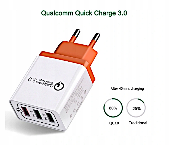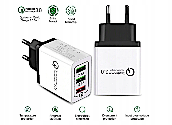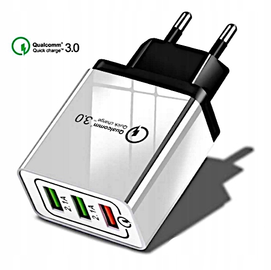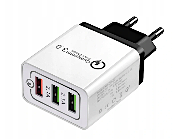 Oferujemy Ci ultra szybką ładowarkę z 3 uniwersalnymi wejściami USB. Umożliwia on naładowanie w jednym czasie 3 różnych urządzeń ze średnią wydajnością ładowania 2.1 A. W razie potrzeby możesz użyć wejścia USB, które naładuje twój telefon, tablet z turbo „ładowaniem" na poziomie 3 A.