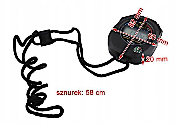 Ogromną zaletą stopera z kompasem jest również praktyczny, mocny sznurek, dzięki któremu nie trzeba trzymać urządzenia w ręce. Stoper wielofunkcyjny może być z powodzeniem przywiązany do plecaka, czy nawet powieszony na szyi – długość sznurka to aż 58 cm.