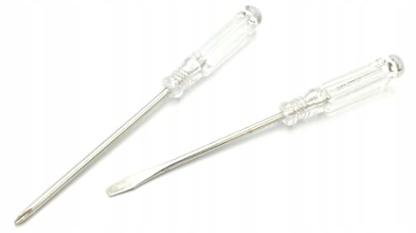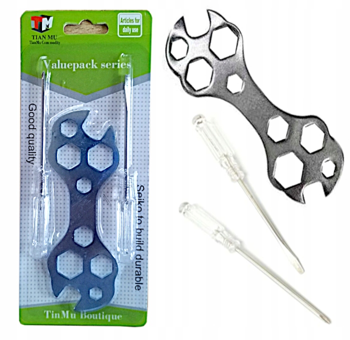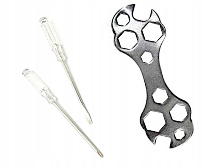 Zestaw zawiera płaski klucz wielofunkcyjny do roweru oraz dwa małe wkrętaki (płaski i krzyżak).