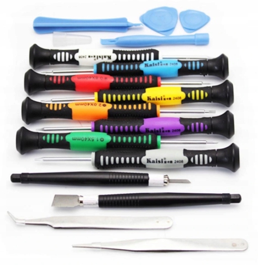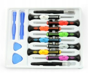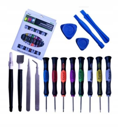 Posiadają magnetyczne końcówki. Dodatkowo zestaw zawiera pęsety, szpatułkę, skalpel i narzędzia przydatne np. do demontażu ekranów.