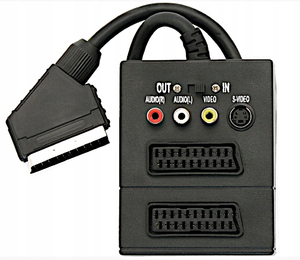 1 wtyk EURO / 2 gniazda EURO , 3 gniazda RCA , 1 gniazdo SVHS i przełącznik IN/OUT